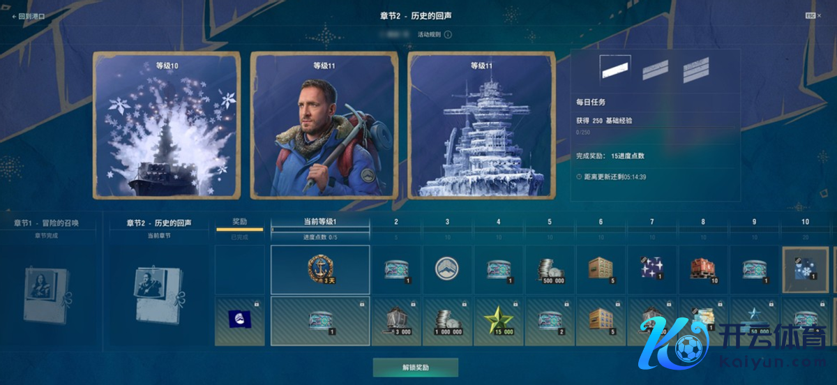 完成第二个历程条,则不错取得“冒险的召唤”记念旗、“前去东方”始终涂装、“圣诞老东说念主的礼物”补给箱15个、“超大号圣诞老东说念主的礼物”1个,以及具有东方元素特质的C系7级战列舰“腾蛇”,这艘船然而探险队们在北极破冰前行的利器哦!