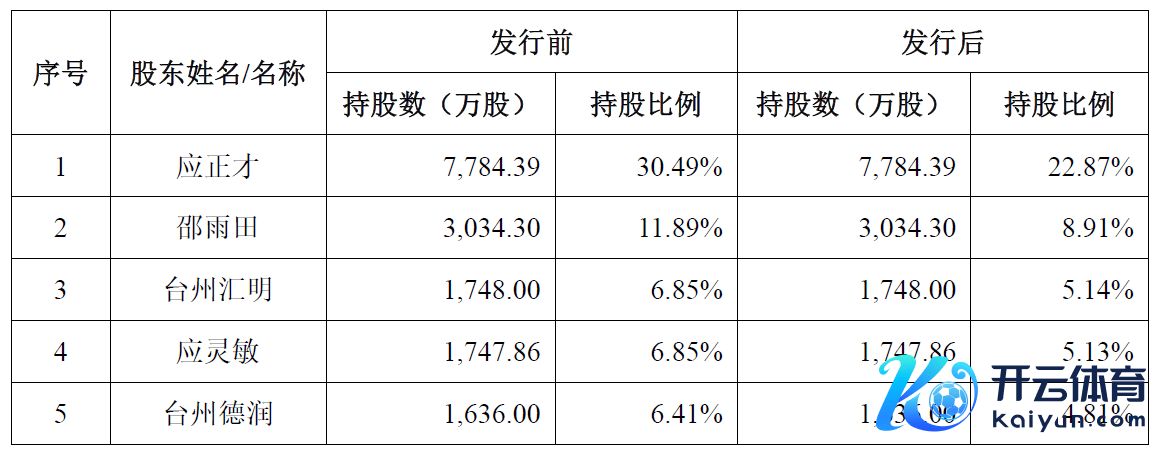 罢休当今,公司实质规矩东说念主为应正才和应贤慧父子,其中,应正才的径直执股比率为30.49%,无波折执股份额,应贤慧径直执股6.85%,通过台州元润波折执股0.01%。而这次IPO,公司拟公开采行不朝上8510万股,占刊行后股本总额比率不低于25%。因此,公司上市后,应正才的径直执股比例将被稀释至22.87%,即使算上另一位实控东说念主应贤慧径直和波折所执有的股份,两东说念主共计控股比例也未朝上30%。
