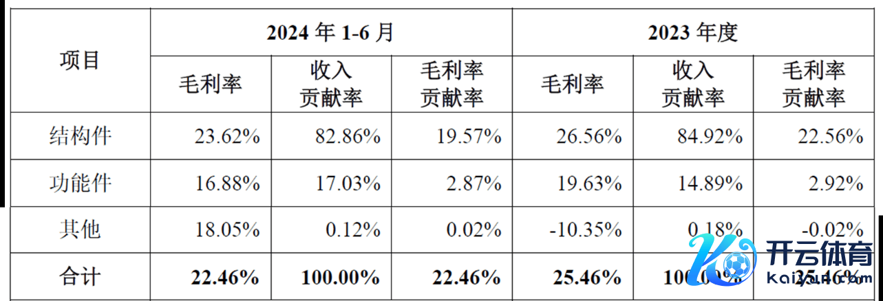 事实上,行业的下行压力已对公司的毛利率变成影响。阐述招股书透露,2021年至2024年1-6月,公司的主买卖务毛利率划分为24.07%、24.26%、25.46%和22.46%。公司对此讲明称:2024 年上半年,部分下搭客户为支吾市集竞争镌汰部分车型整车售价并相应退换零部件价钱,导致当期部分结构件产物平均单价及毛利率有所下跌。