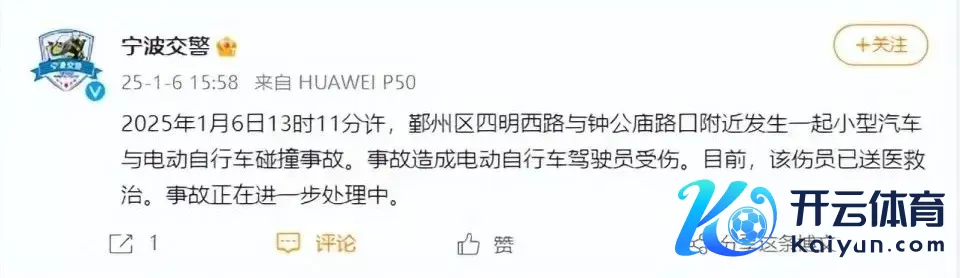 2025年1月6日13时11分许,鄞州区四明西路与钟公庙路口隔邻发生一齐微型汽车与电动自行车碰撞事故。事故变成电动自行车驾驶员受伤。当今,该伤员已送医救治。事故正在进一步惩办中。